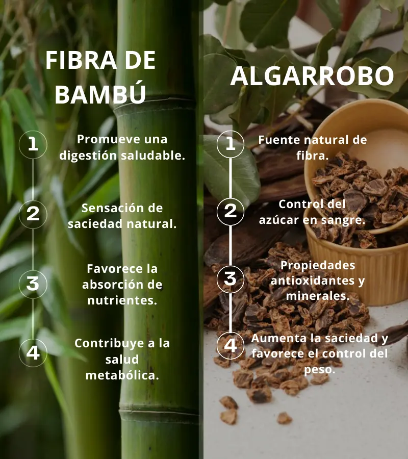 Fibra de bambú y algarrobo, que apoyan la digestión y el bienestar general