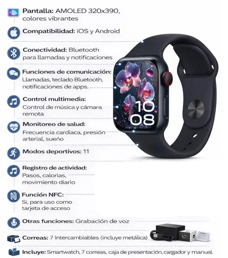 Incluye: Smartwatch, 7 correas, caja de presentación, cargador y manual